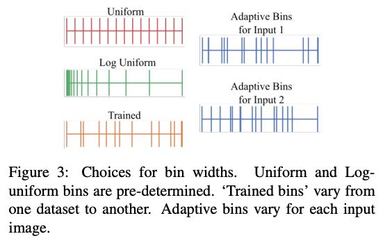 一方で画像によっては深度に偏りが考えられるため、決め打ちのビン幅では表現力が不十分となる。これに対してAdaBinsでは、入力画像に応じて適応的にビン幅を計算することで、予測深度の粒度を調節することができる