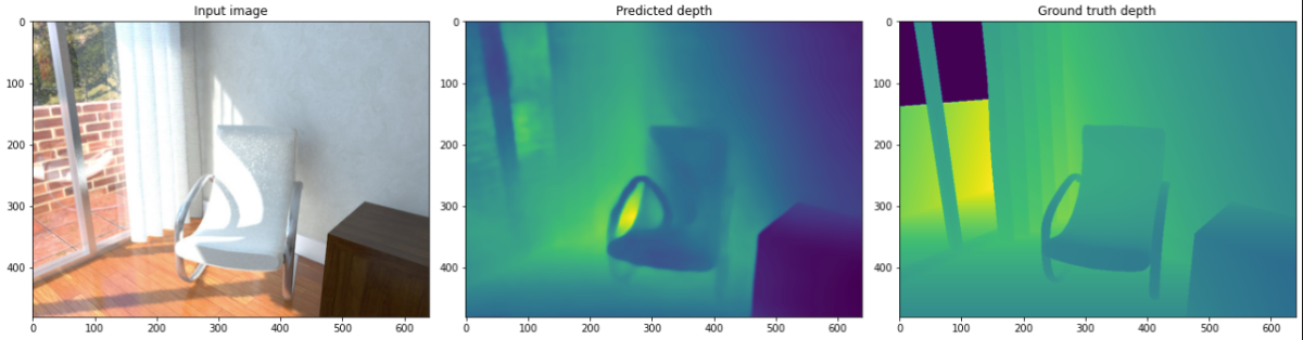 屋内にイスが置かれている画像で検証。左から入力画像、予測結果、正解深度。単眼深度推定にしてはなかなか良さそうに見える。