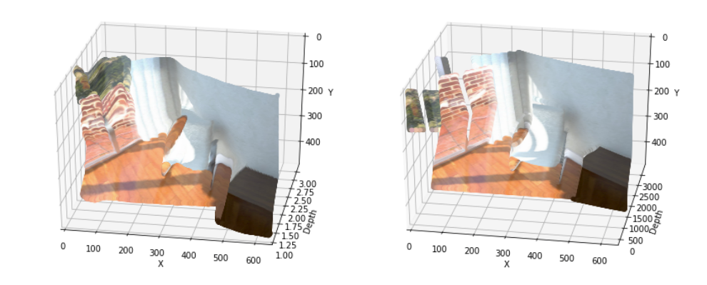 がんばってmatplotlibで可視化した結果が以下。左が予測結果、右が正解。予測結果のdepthはメートル単位、正解の方はミリメートル単位なことに注意。手前の棚(?)と部屋隅の推定が甘い気がするが全体的には合っていそう。