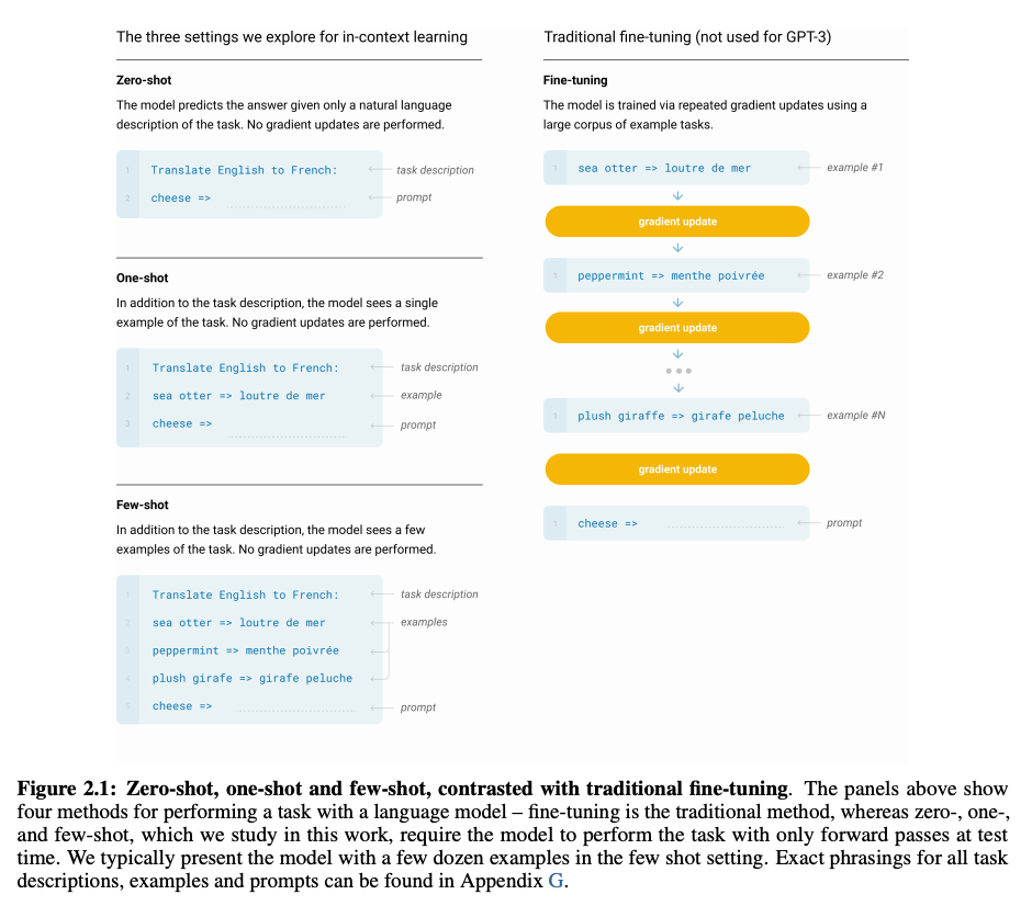 図2.1はこれらの設定を英語→フランス語の翻訳タスクを例にして比較している。今回検証する中ではfew-shotが最も高性能だが、one-shot, zero-shotで優れた性能を発揮したタスクもあり、検証対象として重要である。