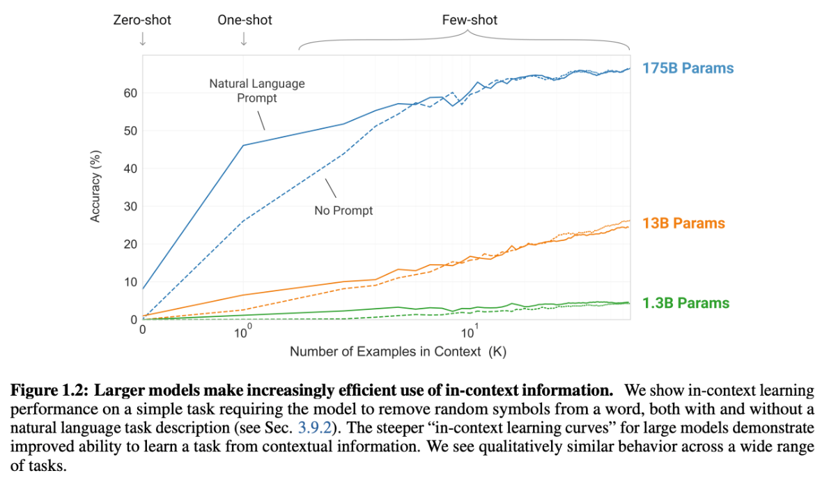 結果的に、タスクの説明と多くのデモンストレーション(K)を与えることでモデルの性能が向上していくことが確認された。またモデルを大きくすることによっても、性能が改善していることがわかる。図1.2は単語に加えられたランダムな文字を除去するというシンプルなタスクでの検証結果だが、他の多くのタスクでも同様の傾向が見られた。