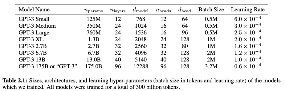 またモデルサイズと性能の関係を検証するために、8種類の大きさのモデルを構築した。最も大きな175BパラメータのモデルがGPT-3である。