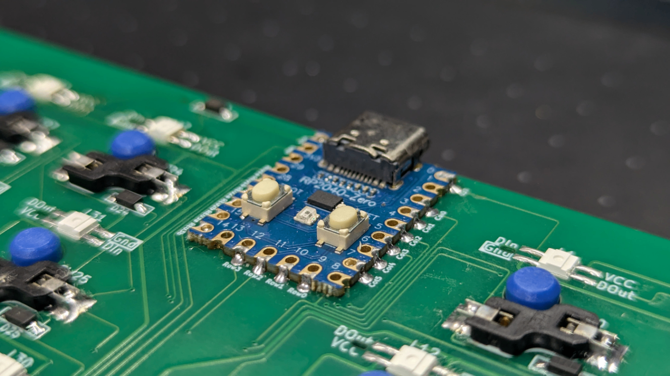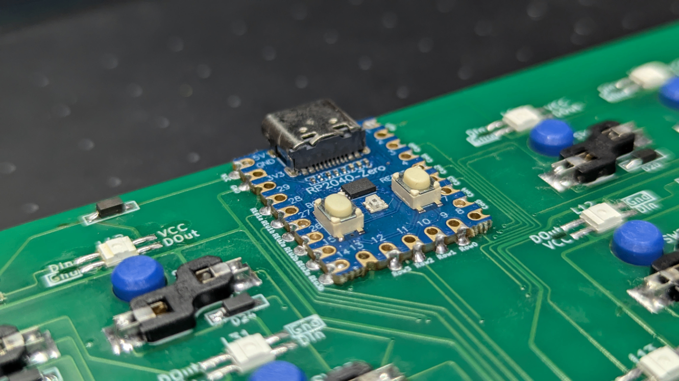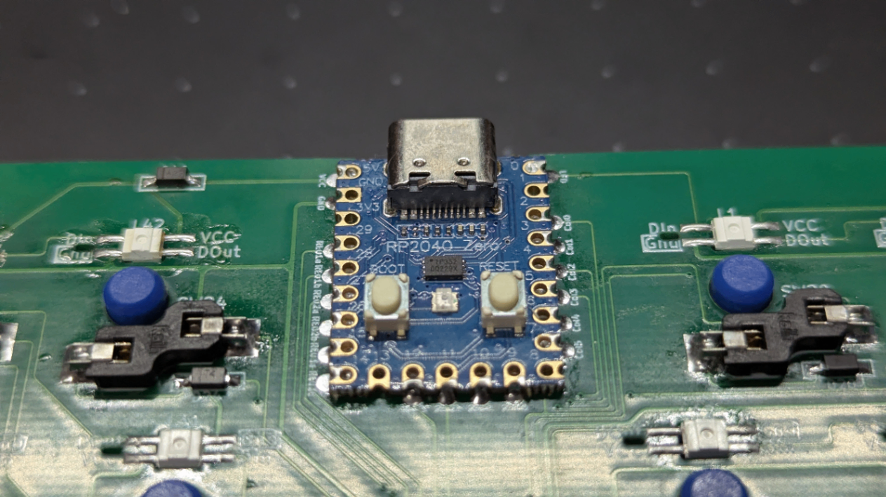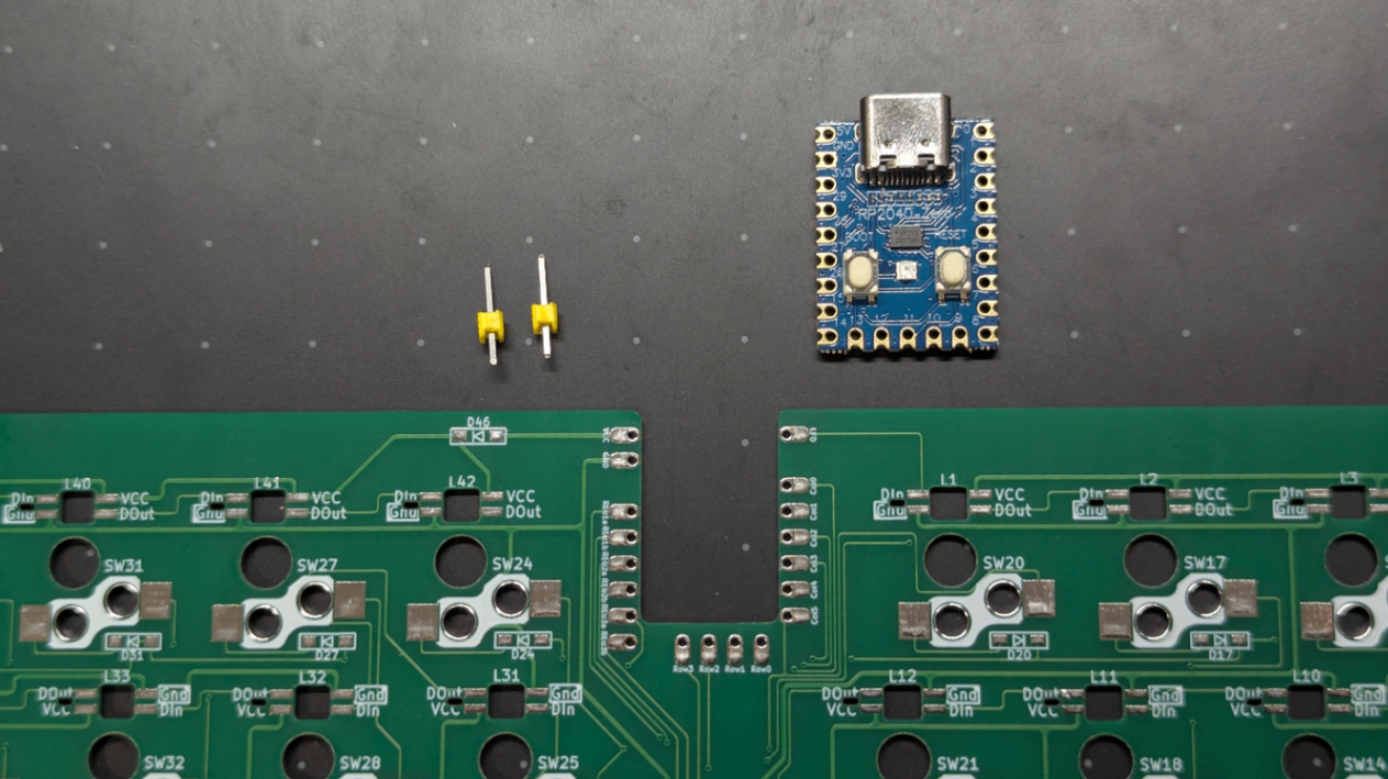 最初にハンダ付けする場所は、RP2040-Zeroが固定状態になる位置ならどこでも大丈夫ですが、他のハンダ付け箇所がズレないように注意してください。