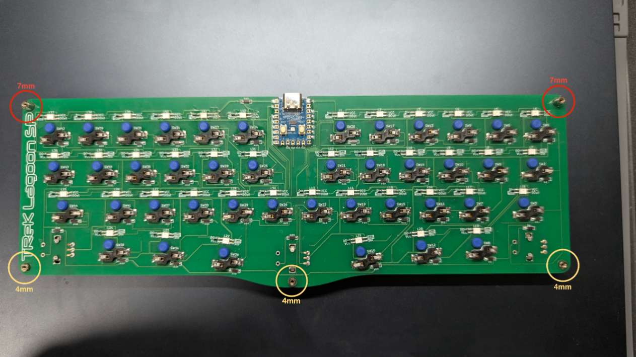 PCBを貫通するようにして、スイッチプレートの奥側(上側)には7mm、手前側(下側)には4mmの丸型M2スペーサーを3mmのM2ネジで固定します。