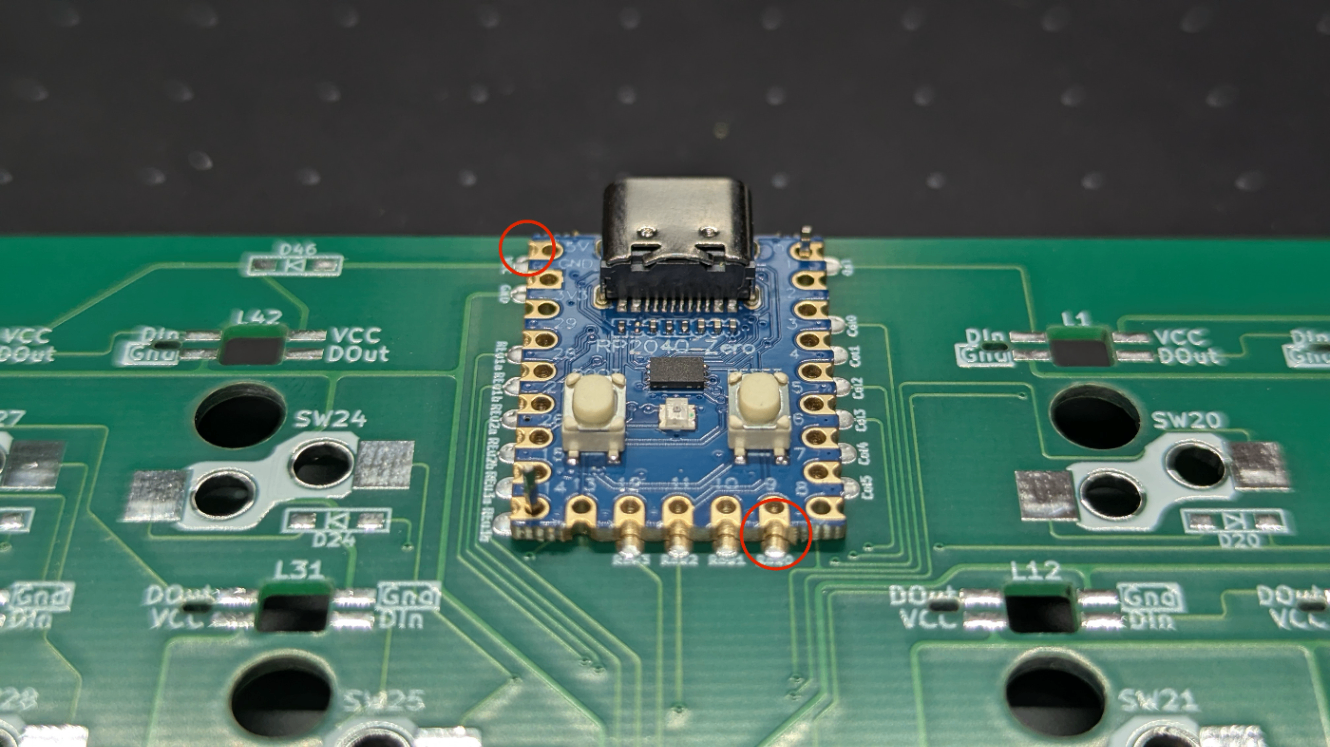 RP2040-Zeroを固定出来たら、赤丸位置の2箇所を表面実装ハンダ付けしてください。