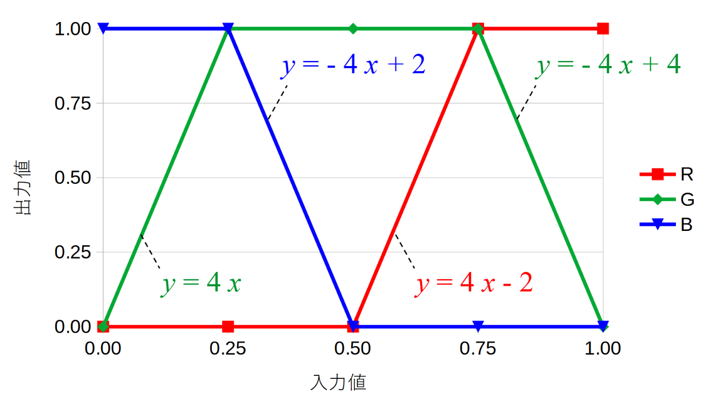 入力値0.0→1.0に対して出力色が青→赤に変化するプログラムをif文を使わずに書きます。