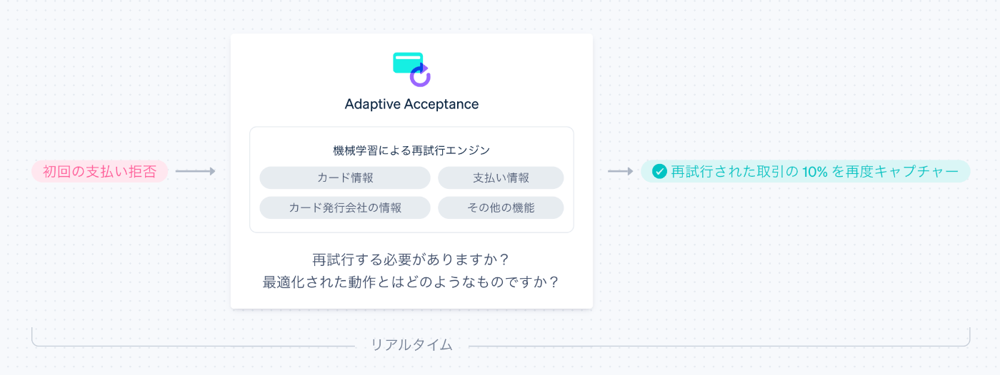一例を挙げますと、StripeはAdaptive Acceptanceという機能を提供しています。同じ決済の電文データでもカード会社によって、処理の「癖」が存在します。カード会社毎に最適な電文のパラメーターパターンを分析し、拒否された時にパラメーターを調整してリトライすることによって、リアルタイムで購入者が感知せず失敗した決済をリカバリしています。