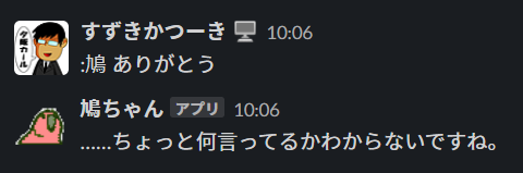 で、コミカルな動きが気に入ってBOTの名前も「鳩」にした次第です。何も間違ってない