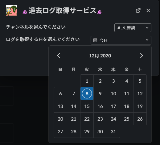 - 指定したチャンネル、日付を選択し、ログを圧縮して返却