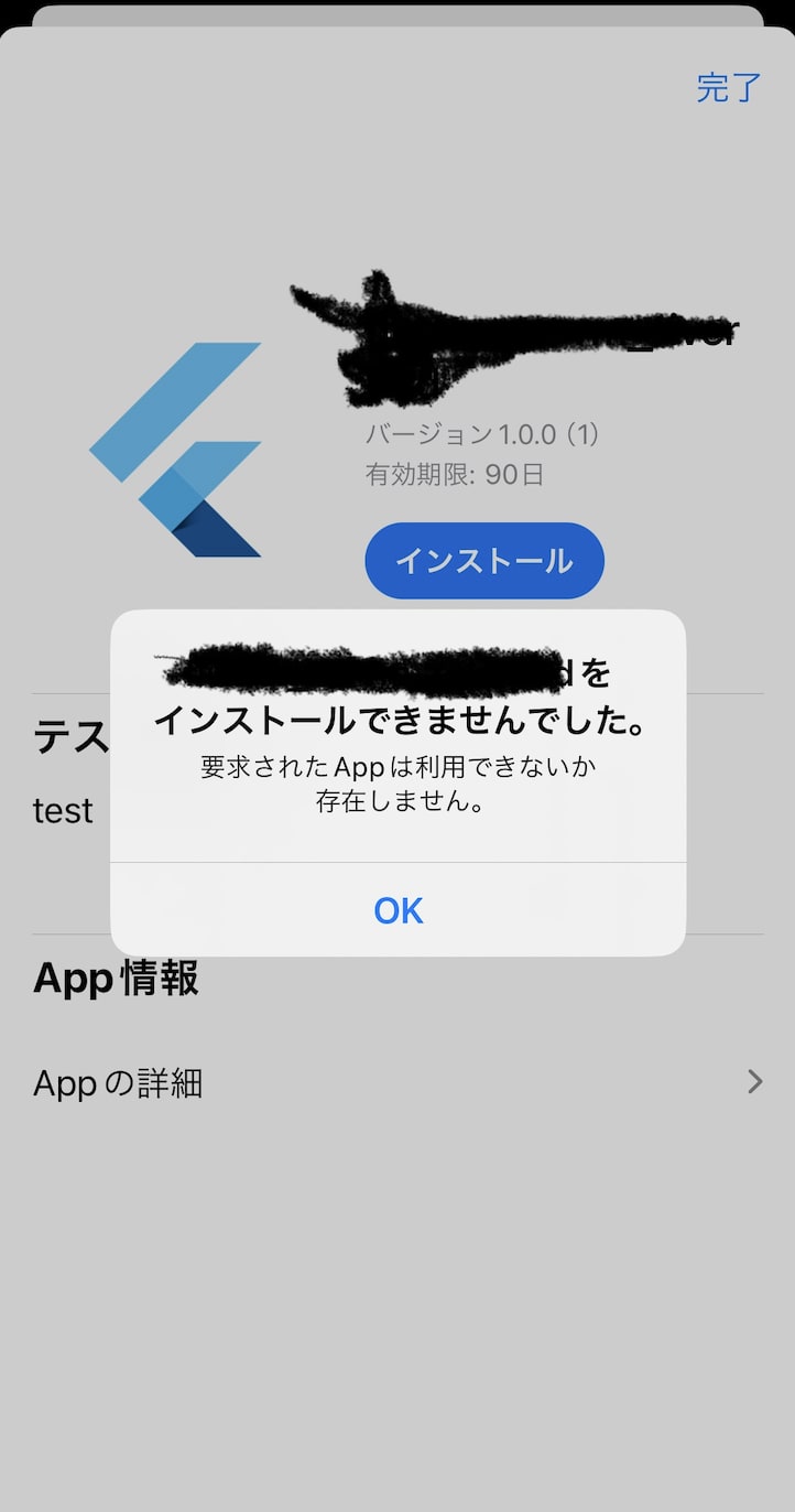 TestFlightで配信したアプリをインストールしようとすると写真のようなエラーが出てインストールできない。