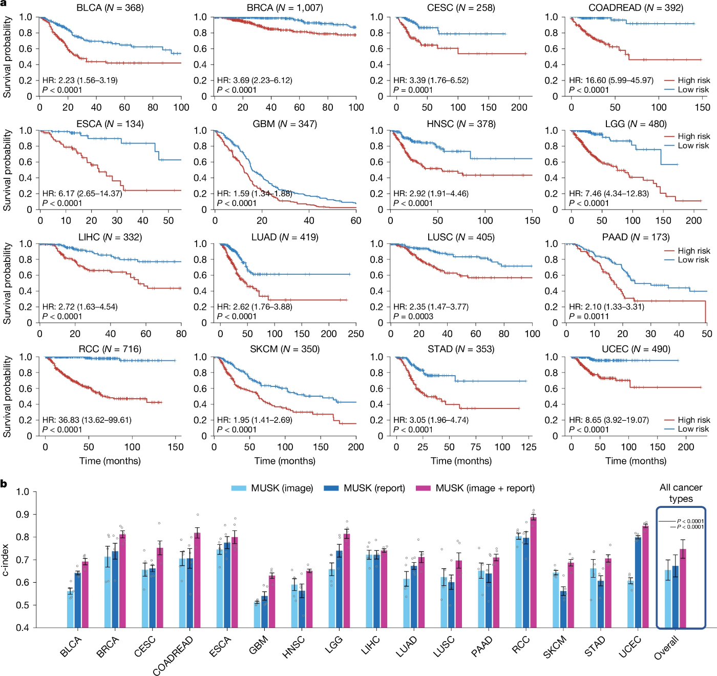 - またFig. 4のbからは、マルチモーダルMUSKモデルが、16種類の癌種すべてにおいて、単一モーダル入力による予後モデルよりも一貫して優れており、c-indexが有意に高い0.746だった。