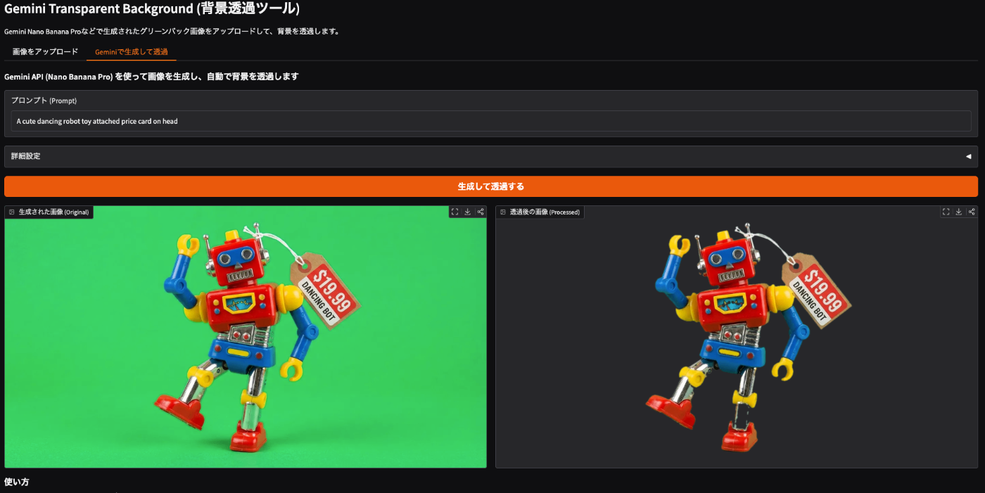 GradioでGemini Nano Banana Proを使用してそのまま透過させるツールを作りました。