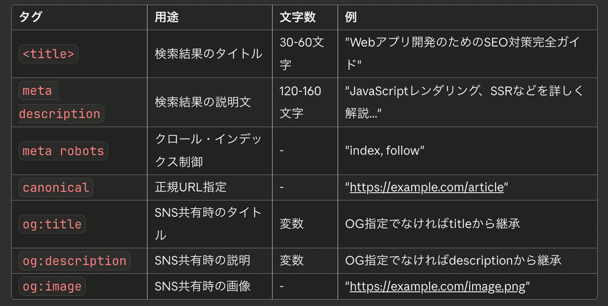 <meta name="description" content="Webアプリ特有のSEO課題を解決するための実装ガイド。SSR、SSG、構造化データなど、段階的な対策を解説。">
