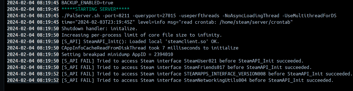 STARTING SERVER欄の[S_API FAIL] Tried to access Steam interface ~が見えたら起動完了