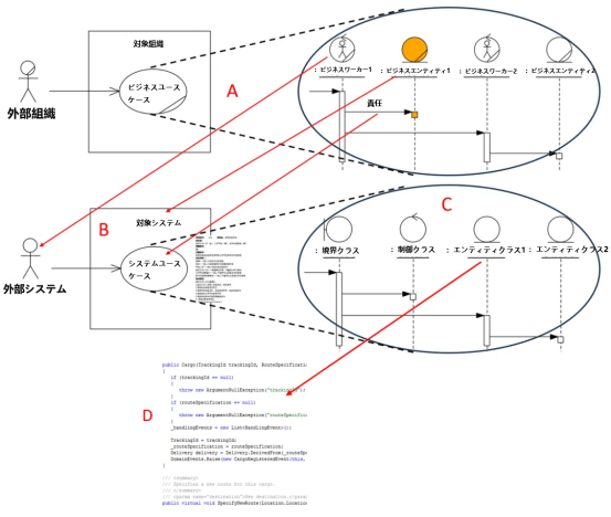 本書では、上記のABCDをソフトウェア開発の4つのモデリングワークフローと呼びます。 本書の方法論とUML表記法を採用した場合、そのABCDは大まかに図1-5のようになります。読者はまずざっと見ておけばよく、図の内容については後で詳しく解説します。