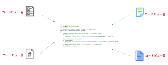 ソフトウェア開発者が上記の「A-ビジネスモデリング」「B-ニーズ」「C-分析」「D-設計」ワークフローの概念を理解していない場合、次のような現象が起こります: ある開発者に「何をしているのか」と尋ねると、「設計をしています」「ドキュメントを書いています」と答えるかもしれません。 実際には、その時彼の頭の中では、組織のプロセス(A-ビジネスモデリング)について考えているのかもしれませんし、システムの機能や性能(B-ニーズ)について考えているのかもしれませんし、システムにカプセル化すべき領域の概念間の関係(C-分析)について考えているのかもしれません。しかし、彼はそれらすべてを「設計をしている」「ドキュメントを書いています」と答えます。 つまり、彼の頭の中では、ソフトウェア開発作業が単純に「コードを書くこと」と「設計をすること(ドキュメントを書くこと)」の二つの部分に分けられているのです。もし彼が「コードを書いていない」のであれば、それはすべて「設計をしている(ドキュメントを書いている)」とみなされます。 では、彼はどのように自分が「コードを書いている」のか「設計をしている(ドキュメントを書いている)」のかを区別しているのでしょうか?おそらく、Visual Studio、Android Studio、Eclipse…などで書かれたものが「コード」と呼ばれ、Word、wiki、Visio、EA…などで書かれたり描かれたりしたものが「ドキュメント」と呼ばれているのでしょう。 この時、誰かが「コードこそが設計だ」というスローガンを唱えれば、さらに厄介なことになります。なぜなら、元々私は「設計」を「コード以外のあらゆるもの」だと考えていたのに、今「コードこそが設計だ」と言われれば、推論すると「コードこそが(ソフトウェア開発の)すべてだ」ということになってしまうからです。 「コードこそが設計だ」というような煽りがなくても、開発者は「設計」(注意:ここでの「設計」は本書で厳密に定義されたDワークフローではなく、「コード以外のすべてのもの」を指します)や「ドキュメント」を「コード」のより概要的または具象的な表現形式と見なします。異なる「設計」や「ドキュメント」は「コード」の異なるビューを表し、開発者が異なる視点からコードを観察できるようにします。図1-6を参照してください。
