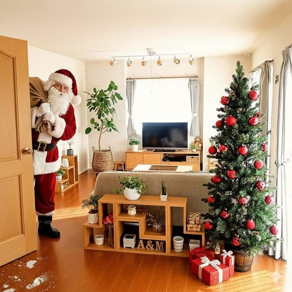 部屋の写真をベースに、少しコミカルで優しい雰囲気のサンタクロースを追加してください。