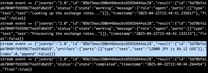 - クライアント用ターミナルにAgent Cardの内容と入力欄が表示されるので今回は