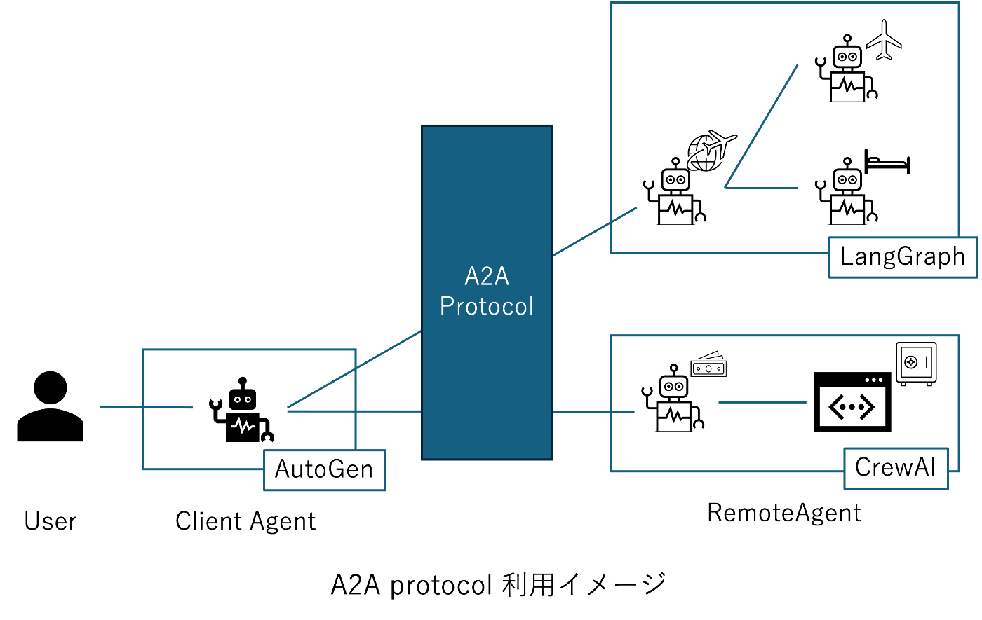 異なるベンダー・フレームワークで構築されたエージェント同士を連携させるためのプロトコル。