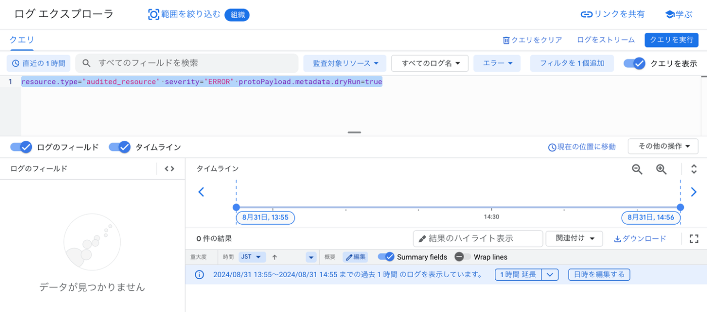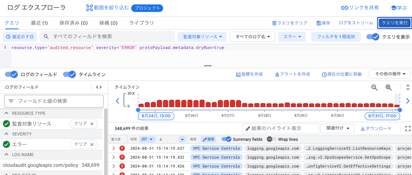 ポップアップが表示され、確認を選択します。メッセージに記載の通り、dryRun=trueとなる境界のログを検索します。