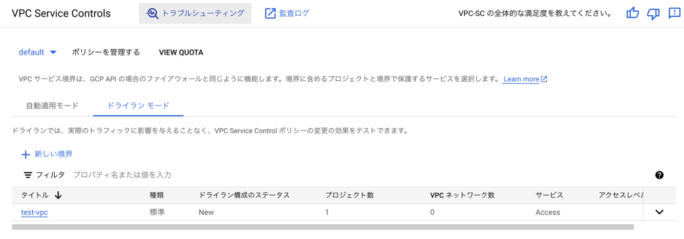 VPC Service Controlsを事前にドライランモードで作成する必要があります。