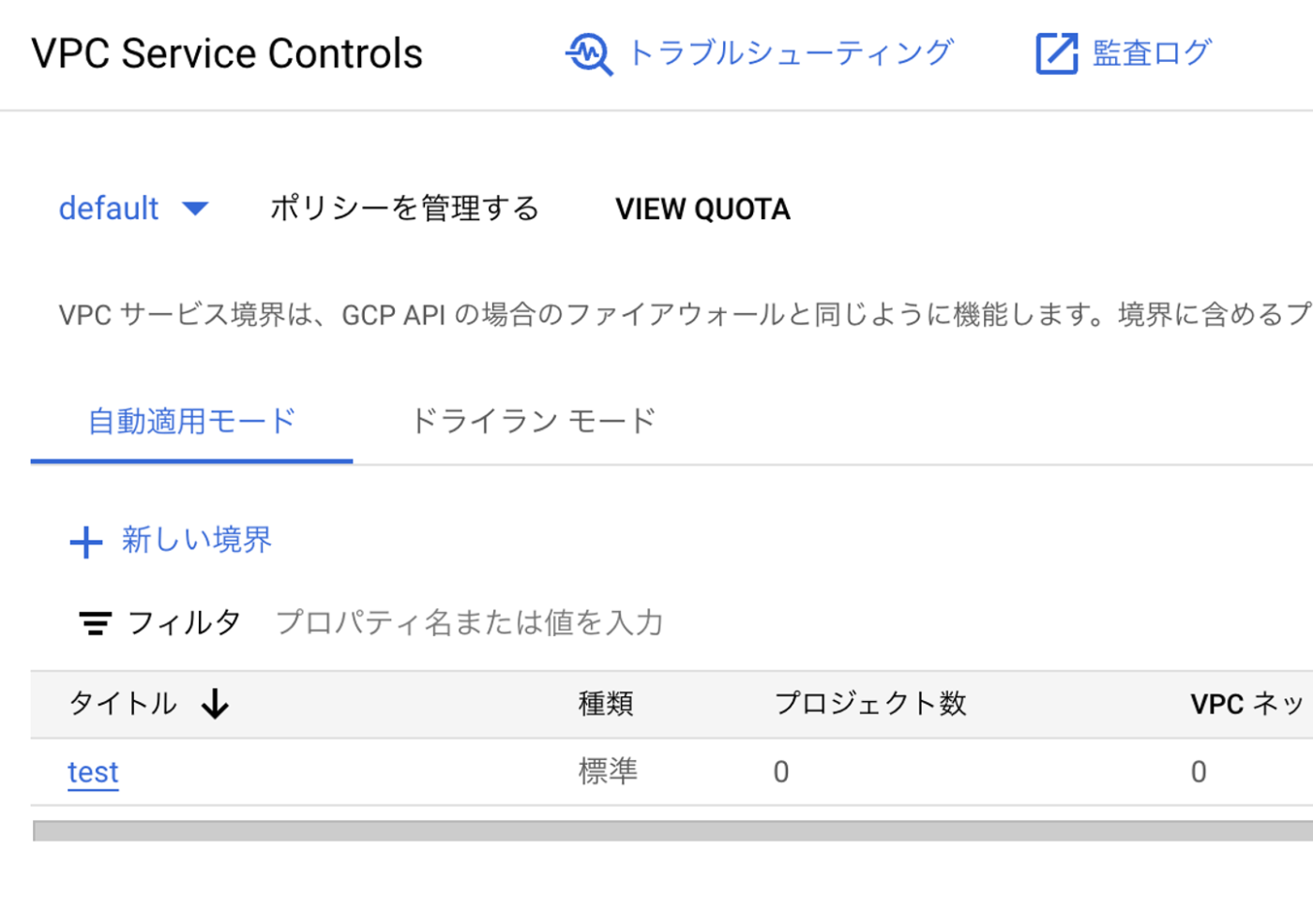 - VPC Service Controlsでドライランモードを選び、新しい境界を選択し境界を設定していきます。