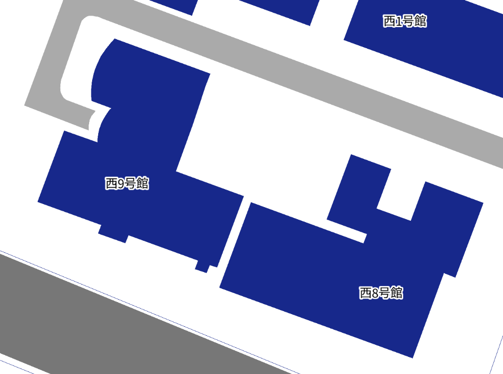 西9号館の曲線や西8号館との角度ずれなどに注目