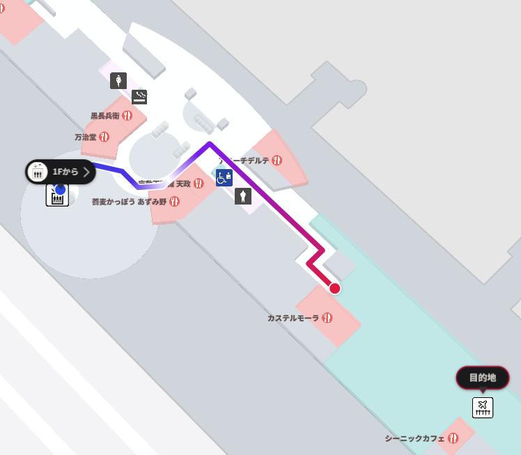 この地図は、屋内マップもインタラクティブに表示されて、さらには経路検索までできるようになっています。
