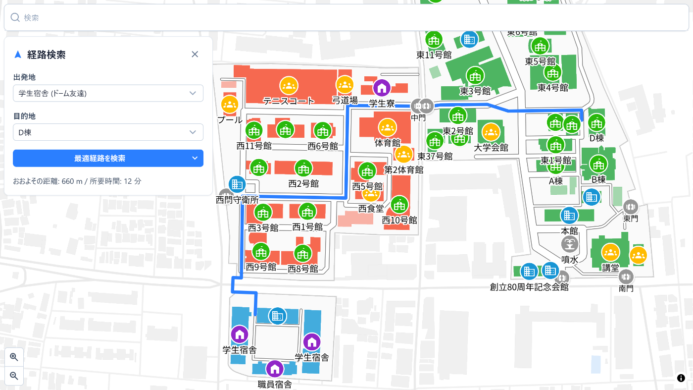 第2世代学内マップでは、A*アルゴリズムによる経路探索機能も組み込みました。遠い建物間であってもおおよその所要時間を計算できるため、移動を始める時刻を見積もる役にも立ちます。また、地区をまたいだ移動では単純な距離に加えて信号待ちが発生するため、数分余裕をもって表示するようになっています。