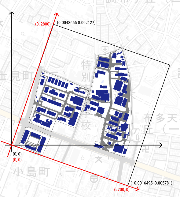 座標の対応関係をうまく示すことができれば、直交座標系のデータを地理座標系でかなり近い場所に配置することができます。