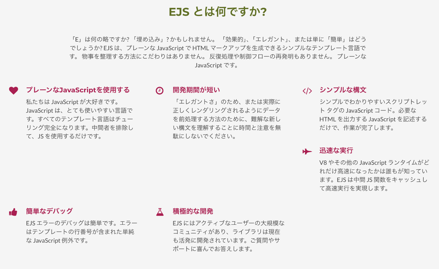 EJS (Embedded JavaScript)はJavaScriptのテンプレートエンジン。