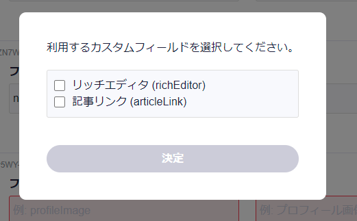 ここで「フィールドを追加」ボタンをクリックすると、どのカスタムフィールドを使って入稿するかを選択できます。