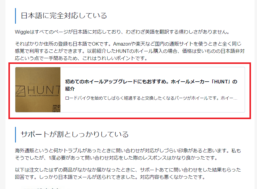"description": "ロードバイクを始めてしばらく経過すると交換したくなるパーツがホイールです。ホイールは高価なパーツのため購入しづらいですが、コスパに優れたホイールを取り扱う「HUNT」は初心者にもおすすめできるメーカーです。\n\n今回はHUNTの紹介と、実際に商品を注文してから到着するまでの流れについて紹介します。",