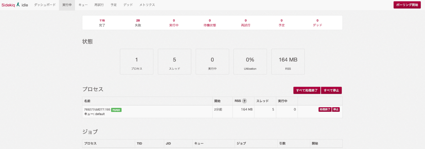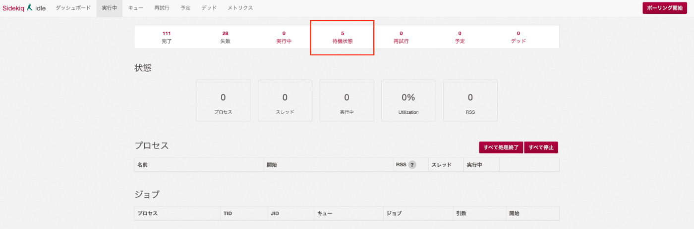 もう一度 /sidekiq/busy を確認すると、「待機状態」が0になり、