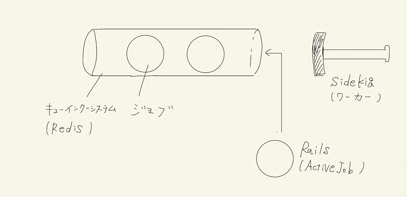 めっちゃ拙い絵で申し訳ないですが、Rails, Sidekiq, Redis の各立ち位置としては以下のような感じです。