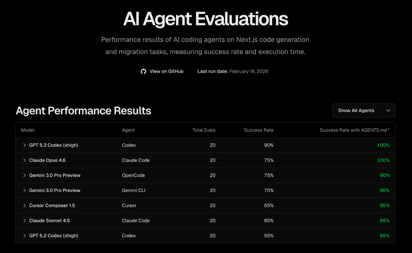 今回使ったevalはどちらもVercel公式の next-evals-oss から持ってきたものです。こちらもagent-evalを使ってテストしています。Next.js向けに20個ほどevalが公開されているので、自分のプロジェクトのevalsを作る際の参考にしてみるのも良いです。ちなみに各モデル、エージェントのnext-evals-ossでのテスト結果がここで公開されています。2026/2/23の時点だと一番パス率が高いのはGPT 5.3 Codex (xhigh) × Codexの組み合わせでした。