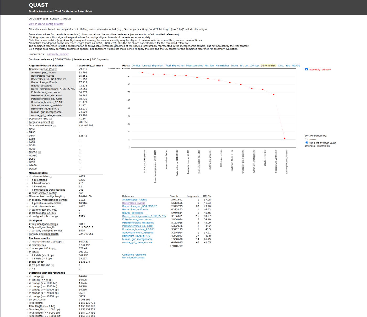 metaQUASTを実行したことがなかったので解析かけましたが、あくまでメタゲノムデータから取得したcontigを使ったゲノム比較なので、この段階でのmetaQUASTの結果の有用性は低いかもしれません。