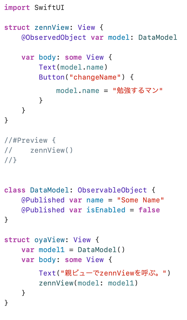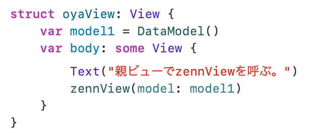 @StateObject var model: DataModelで、DataModelを参照する変数を宣言し、oyaViewでインスタンス化したDataModelを代入する。