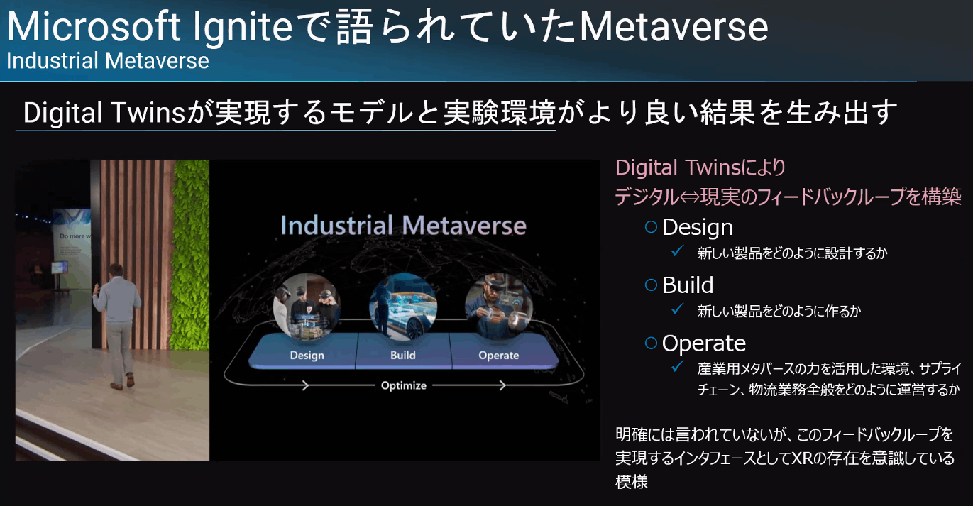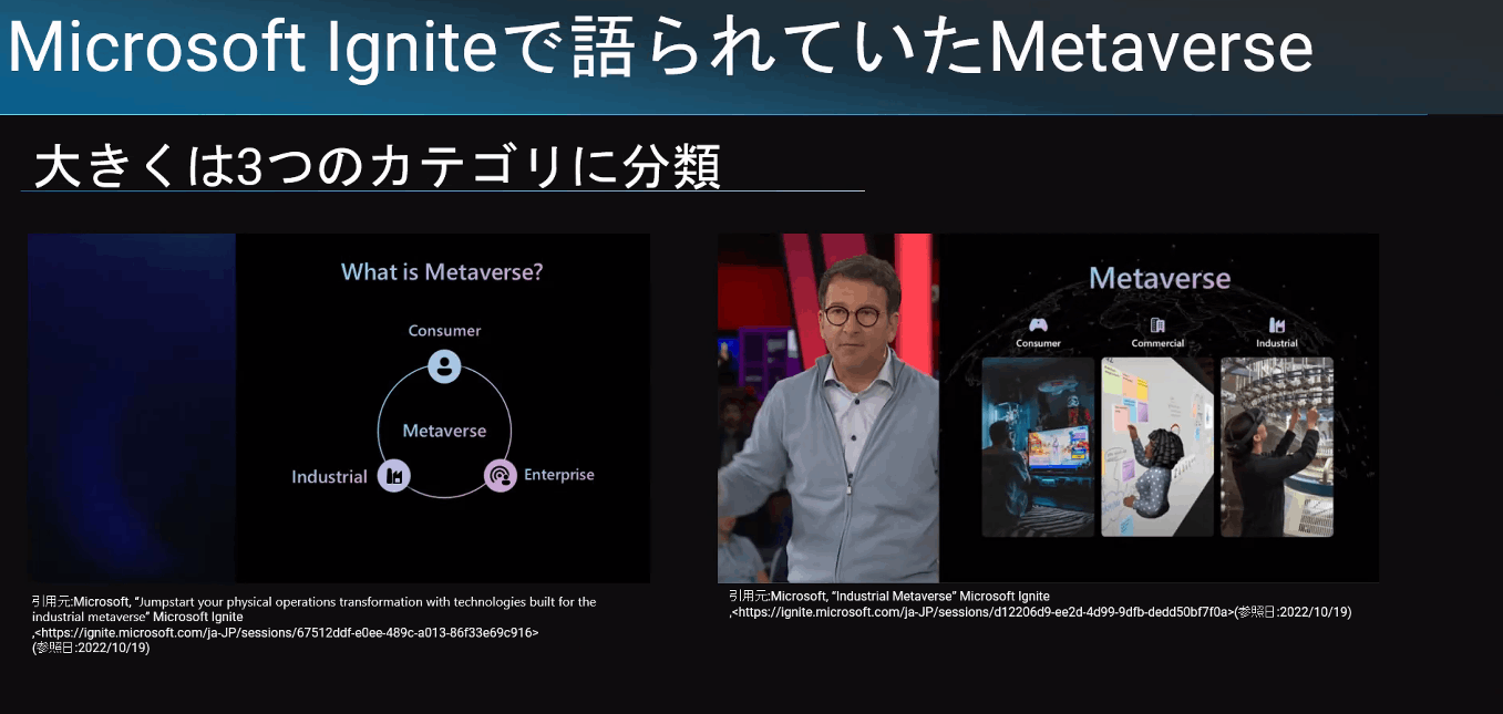 セッションによって、メタバースの説明が異なっているが、メタバースは、「コンシューマー、インダストリアル、エンタープライズ」の3つに分かれるという話。