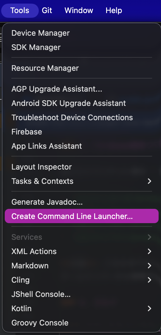 Android StudioのTools > Create Command Line Launcher... を選択します。