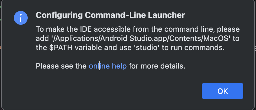 すると、/Applications/Android Studio.app/Contents/MacOSを$PATH環境変数に追加してくださいと案内されるのでパスを通していきます。
