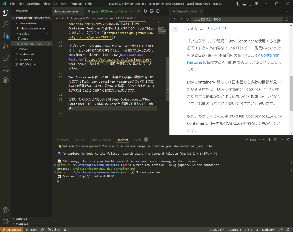 なお、もちろんこの記事もGitHub Codespaces上のDev Containerで書かれています。