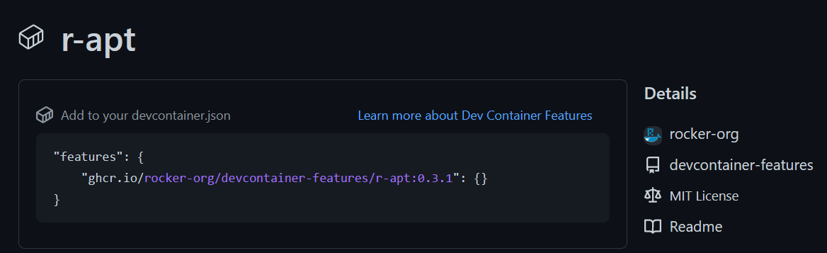 例えば現在いくつかR関連のDev Container FeatureがVSCode Dev ContainerのUIやGitHub CodespacesのDev Containerエディタで見つかりますが、それらは以下のリポジトリで私の公開したものです。