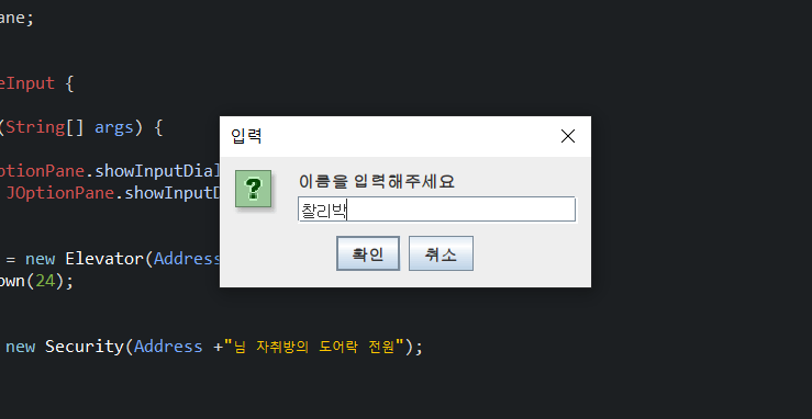 String型変数AddressはJOptionPaneのShowInPutDialog("이름을 입력해주세요")を呼び出して出る値だ。