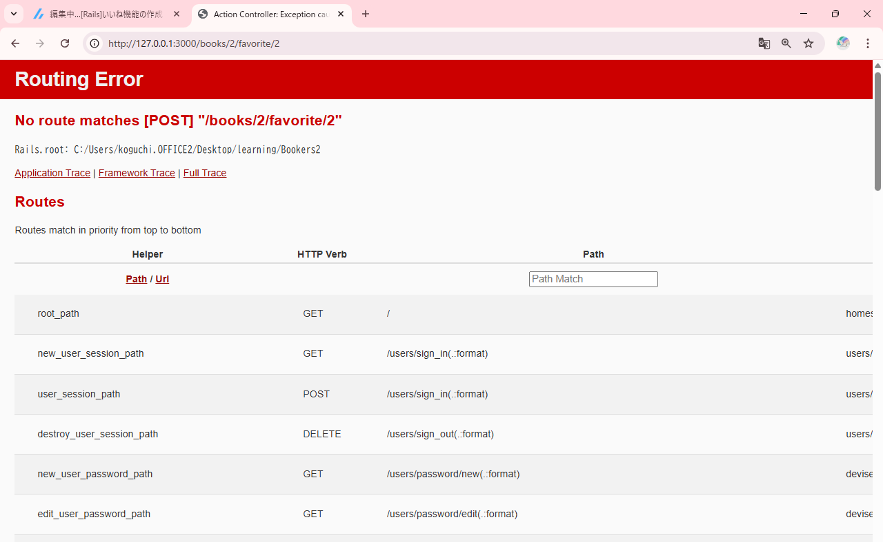 「/tasks/2/favorite/2」のURLにアクセスし、ルーティングエラーとなる。
