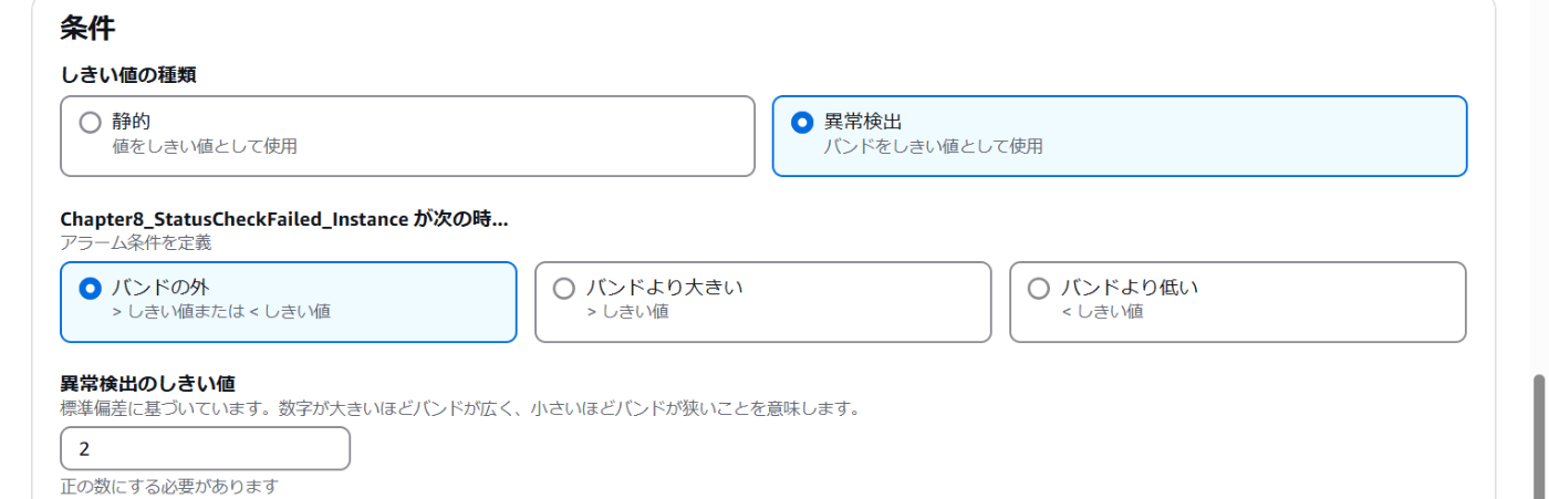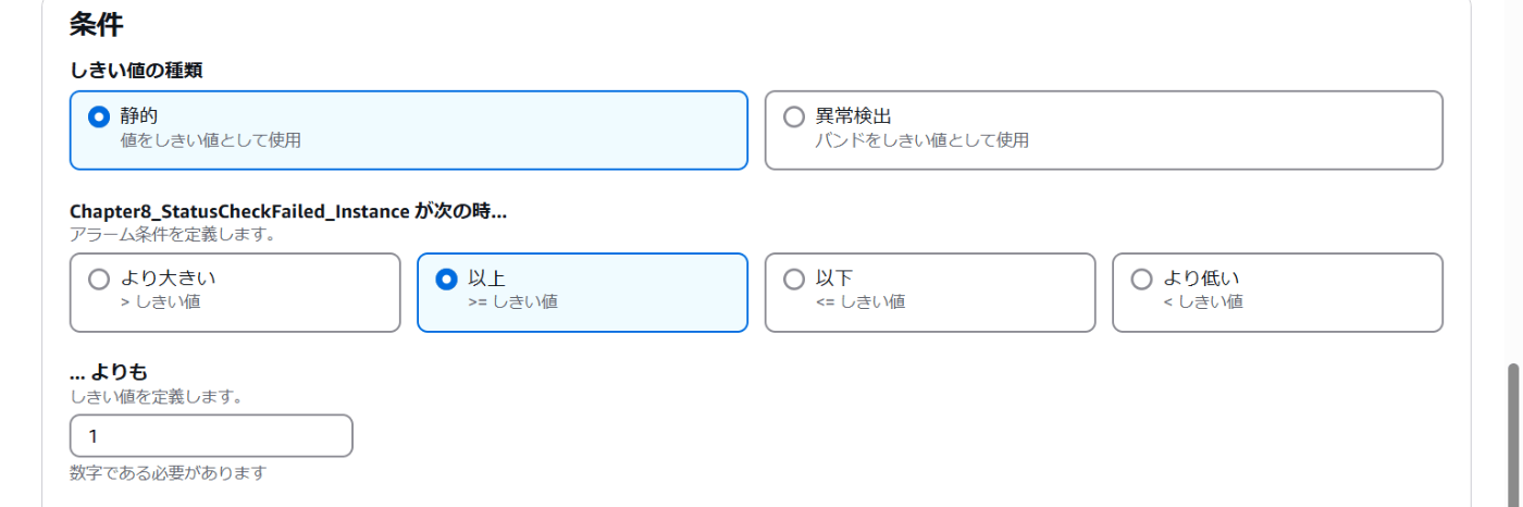 CloudWatchアラームが発火するための特定の値。特定の値以外ではアラートを出す。