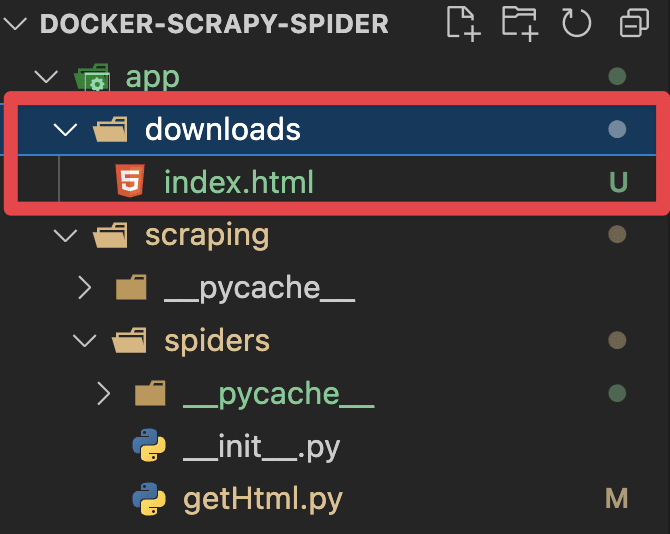 実行がうまくいくと下記の画像のようにapp/downloadsディレクトリの中にindex.htmlが作成されているはずです