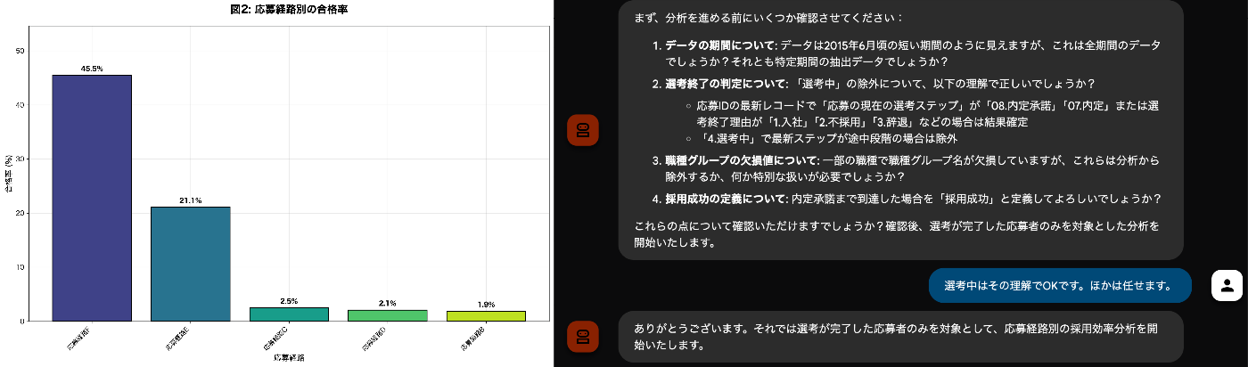 こうした背景から、特化エージェントのワークフローの定義(データの確認・分析可能なテーマの立案・背景の問い合わせ)やツール定義をデータ分析に対して作り込むとどう変わるか?という検証、プロトタイプの開発を行ってきました。 下図はエージェントとのやり取りと、出力レポートを一部抜粋したものです。CSVデータだけアップロードした状態から、何について分析するかをエージェント側から提案し、データに関する前提(例: 選考中のものは除いて良いのか?)などを自律的に問い返し、分析者の知りたい情報に絞った素早い分析を行えています。