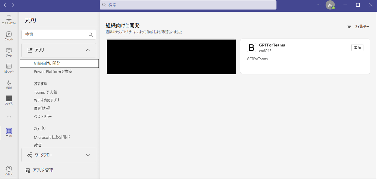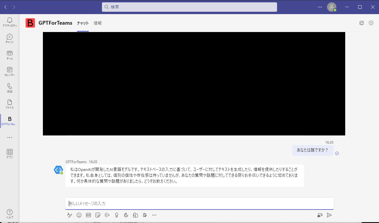 Teamsの左のツールバーからGPTForTeamsを選択するか、画面上の検索バーからGPTForTeamsを検索して出てきたチャット画面に何か文字を入力する。入力すると、ChatGPTからの返信が書き込まれる。