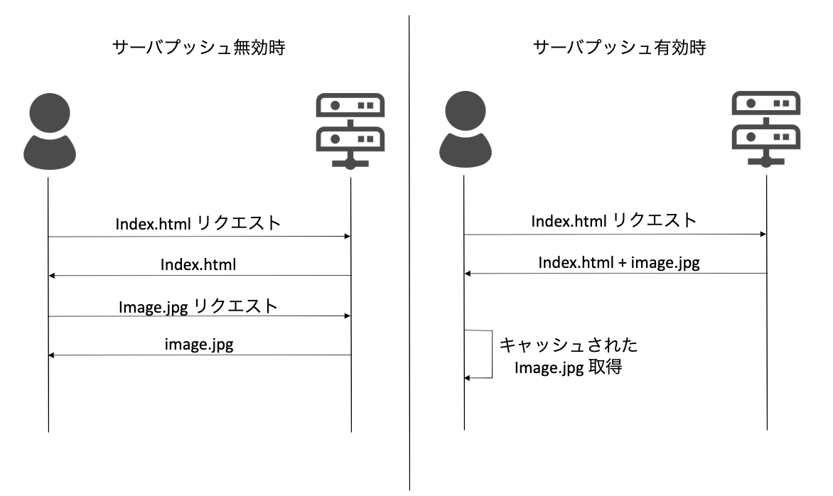 - 基本的に HTTP による通信はクライアントがサーバに対してリクエストを実行し、リクエストを受け付けたサーバがそのリクエストに応じた処理を実行しレスポンスを返すといったもので、一連の処理は必ずクライアントから始まっていました。これに対してサーバプッシュとは、クライアントからのリクエストが実行される前に、サーバがコンテンツをクライアントに対して送信するという機能です。クライアントは実際にそのコンテンツをリクエストするまでは、そのコンテンツがサーバから送信されていることを認識することはできませんが、リクエストを実行すれば通常よりも短い時間でコンテンツを取得することが可能となります。以下にサーバプッシュを実装した場合と実装しなかった場合の処理フローの概略図を示します。